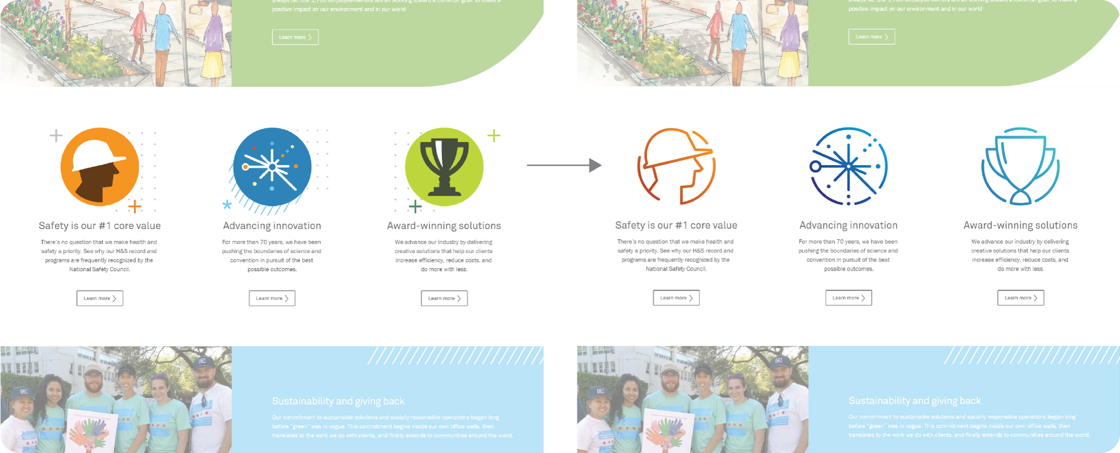 The existing icon library served the company well for over 10 years but the style had become outdated, lacked versatility, and was too complex. There was also a need for Brown and Caldwell to differentiate from their competition who were using icons in an similar style.
